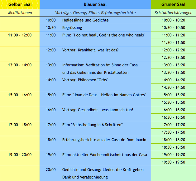 Wie Sie sehen, ist der gelbe Saal für Meditationen, der blaue Saal für Vorträge und Filmvorstellungen und der grüne für Kristallbettsitzungen reserviert.